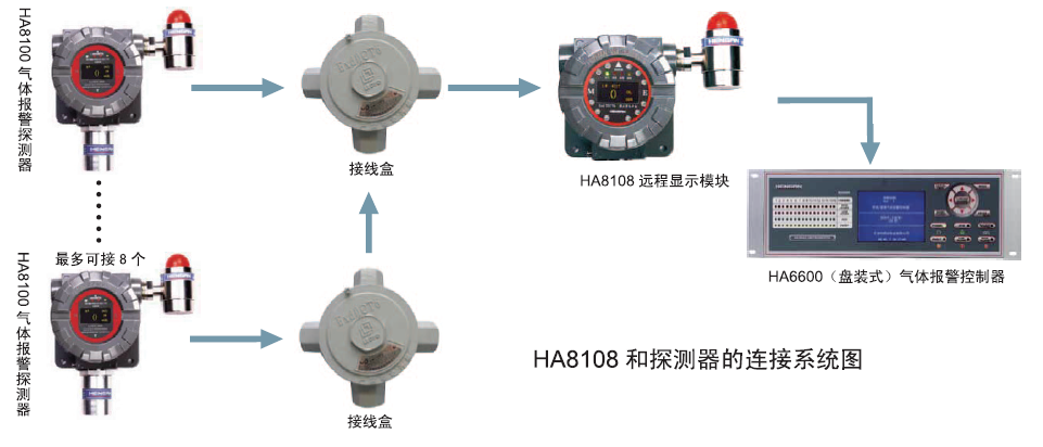 探測器向氣體報(bào)警控制器傳送標(biāo)準(zhǔn)4~20mA信號的能力不受影響,即可在HA8108模塊和控制器兩處同時(shí)顯示探測器狀態(tài)。