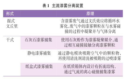 一套完整的噴漆室系統(tǒng)通常由送排風(fēng)、動(dòng)靜壓室、噴漆室體、漆霧分離裝置四大部分組成。前三者的規(guī)劃設(shè)計(jì)受到節(jié)拍、產(chǎn)品尺寸、噴涂形式等因素的影響,但主體結(jié)構(gòu)大同小異,對(duì)于噴漆室系統(tǒng)而言最主要的分歧集中在漆霧分離形式的選擇上。采用不同形式的漆霧分離裝置會(huì)對(duì)一次投資、維護(hù)運(yùn)營(yíng)、廢氣排放等方面造成不同程度的影響。表1列舉了目前汽車制造業(yè)主流的噴漆室漆霧分離裝置,根據(jù)分離裝置對(duì)漆霧顆粒捕集媒介的選擇,可以簡(jiǎn)單分為濕式和干式兩大類。