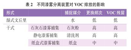 無論選用哪種形式的漆霧分離裝置,最終都將產(chǎn)生漆霧捕捉媒介與過噴漆霧的混合物,假設(shè)該混合物在收集后可以做到密閉保存、運(yùn)輸,那么最終混合物內(nèi)的VOC含量就是漆霧分離裝置對(duì)噴漆系統(tǒng)的VOCs減量。不同漆霧分離裝置對(duì)VOCs排放的影響見表2。