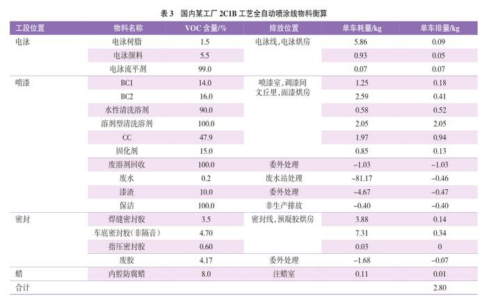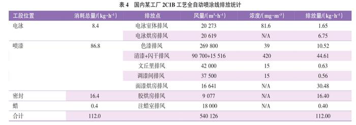 為了明確油漆車間各工藝環(huán)節(jié)的實(shí)際排放情況,本文就國(guó)內(nèi)某工廠2C1B工藝全自動(dòng)噴涂線的實(shí)際情況做了以下實(shí)測(cè)統(tǒng)計(jì)。