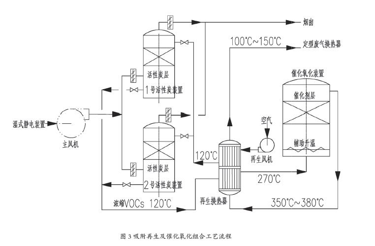活性炭吸附有機廢氣接近飽和后引入熱空氣對活性炭進(jìn)行再生,脫附下的高濃度有機廢氣進(jìn)入催化床進(jìn)行催化氧化分解。