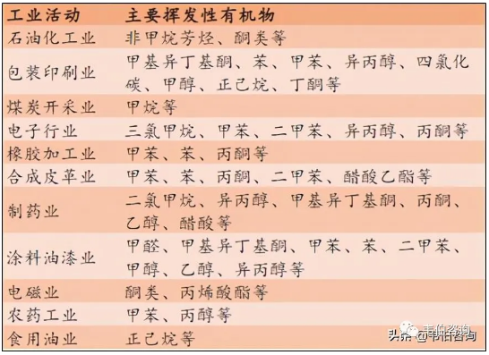 圖表1:各行業(yè)排放的VOCs成分匯總表