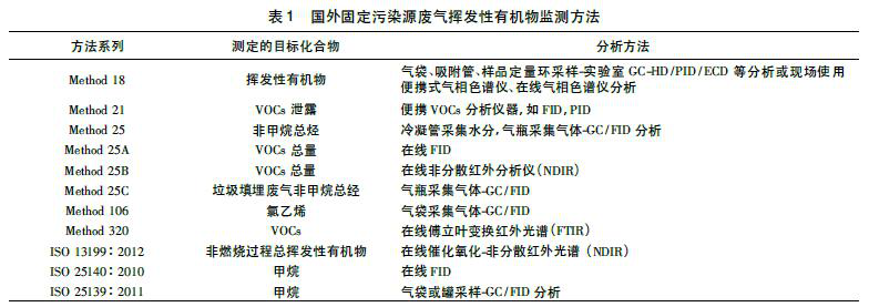 美國環(huán)保署推出的VOCs監(jiān)測方法有環(huán)境空氣VOCs分析方法、室內(nèi)空氣VOCs分析方法和固定源廢氣VOCs分析方法。固定污染源廢氣多采用在線分析儀進(jìn)行現(xiàn)場分析,如在線GC-MS /FID/PID/ECD 等,還可使用傅立葉變換紅外光譜和非分散紅外分析儀,還可將廢氣采集于氣袋或氣瓶中后再進(jìn)行分析。國際標(biāo)準(zhǔn)化組織( ISO) 也發(fā)布了關(guān)于VOCs檢測的標(biāo)準(zhǔn)方法,對于固定源廢氣主要采用在線方法,如催化氧化-非分散紅外光譜、GC/FID 等。具體監(jiān)測方法見表1。
