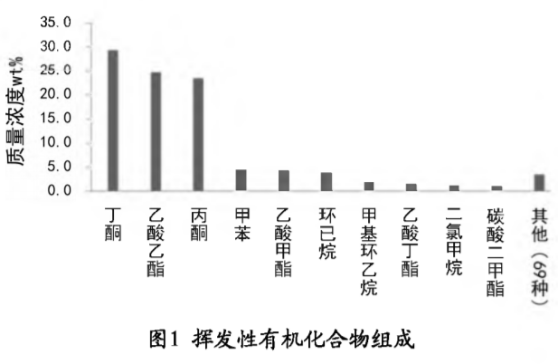 分析發(fā)現VOCs的危害主要表現在大氣環(huán)境(組成成分與類型見圖1、2),具體表現為兩點:首先VOCs具有光化學特點,受到太陽光、熱條件作用,N0x、VOCs會形成不同的光化學氧化劑。因為臭氧占比超過90%,所以臭氧便成為光化學氧化劑中最為典型的物質。臭氧的存在將氧化大氣內部SO2,NOx、VOCs氧化,氧化后形成的物質會為二次PM2.5提供必須的陰離子,和大氣內部的陽離子結合之后,可以組成無機二次PM2.5,與有機氣溶膠融合,會形成二次PM2.5;其次,VOCs與光化學產物屬于毒害物質,與人體接觸會危害身體健康。